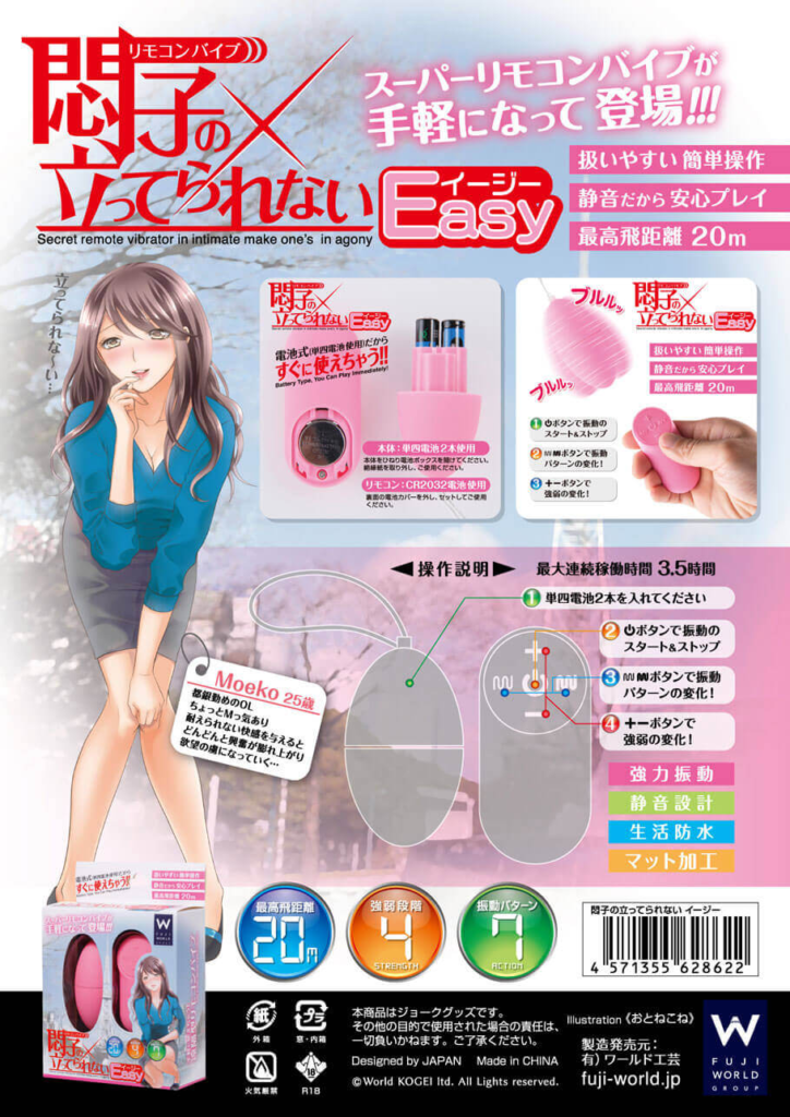 とびっこシリーズを代表する遠隔操作タイプのローター。造りがイマイチなものも多い中、しっかりとした造りと性能が魅力の「悶子の立ってられないR」の廉価版悶子の立ってられないイージー。充電式ではない、振動の強さが劣るなど、機能や性能が劣る分価格がおよそ半額というリーズナブルなタイプです。
